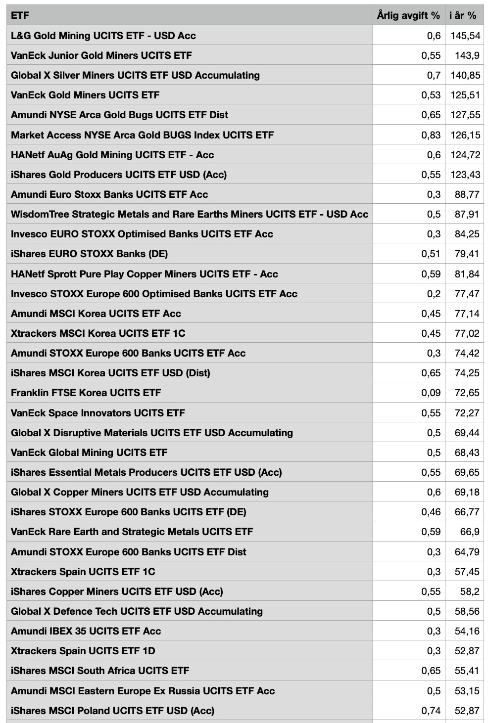 Bland de hundra bäst presterande ETF:erna under 2025 är det några teman som sticker ut tydligt: ädelmetaller, gruvbolag, strategiska metaller, europeiska banker – och ett antal regionala marknader som Korea, Latinamerika, Afrika samt delar av Öst- och Sydeuropa.