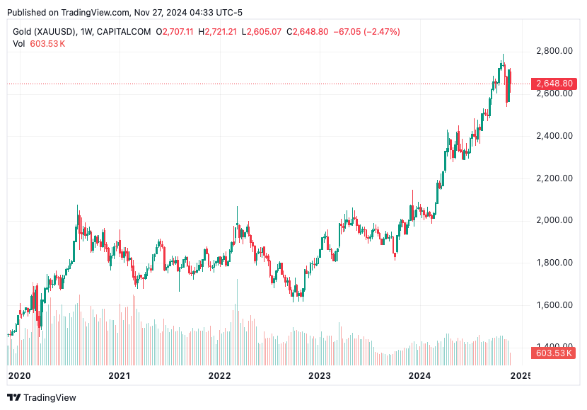 Osäkerheten efter Trumps vinst i det amerikanska presidentvalet har ökat intresset för guld som en trygg investering. Hans politik och de potentiella ekonomiska följderna har skapat en viss oro på marknaderna, vilket gör att många investerare söker sig till guld som en stabil tillgång i osäkra tider. Samtidigt fortsätter centralbankernas guldköp att stödja prisutvecklingen.