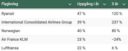 Tredje bästa flygbolagsaktien i år är Norwegian, vars aktie stigit med inte mindre än 37 procent. Norwegian är också en av de mest direktägda norska aktierna i svenskarnas portföljer. Bara hos Avanza finns aktien i inte mindre än 45 000 depåer.