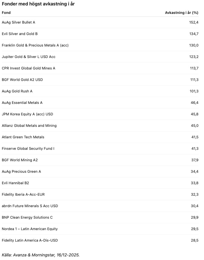 2025 har varit ett år med ovanligt tydliga vinnare. Kapital har i hög grad lämnat breda indexstrategier och i stället sökt sig till reala tillgångar, selektiva regioner och teman där utbudet inte har hängt med efterfrågan. Att techfonder saknas i toppskiktet är därför logiskt. En stor del av värdeskapandet under året har skett tidigare i värdekedjan, i metaller, elnät och industriell kapacitet.