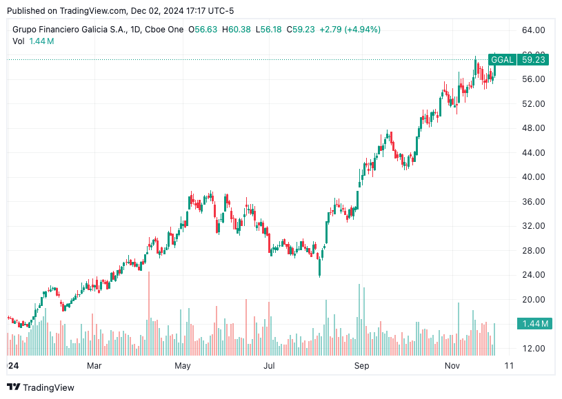 Allra bäst har det gått för en av Argentinas största finanskoncerner Grupo Financiero Galicia, vars aktie är upp 227 procent i år.