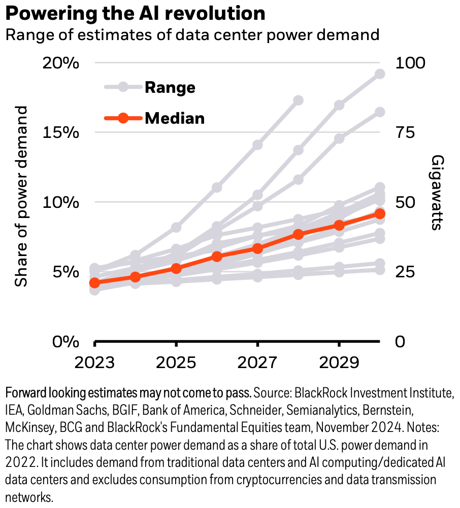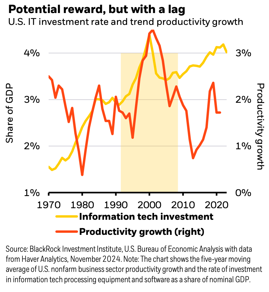 Tidslinjen och omfattningen av AI:s påverkan på den breda ekonomiska tillväxten är fortfarande osäker. Enligt Blackrocks uppfattning beror denna påverkan på två faktorer: hur effektivt AI kan omvandla specifika uppgifter och hur brett det kan tillämpas inom olika branscher.