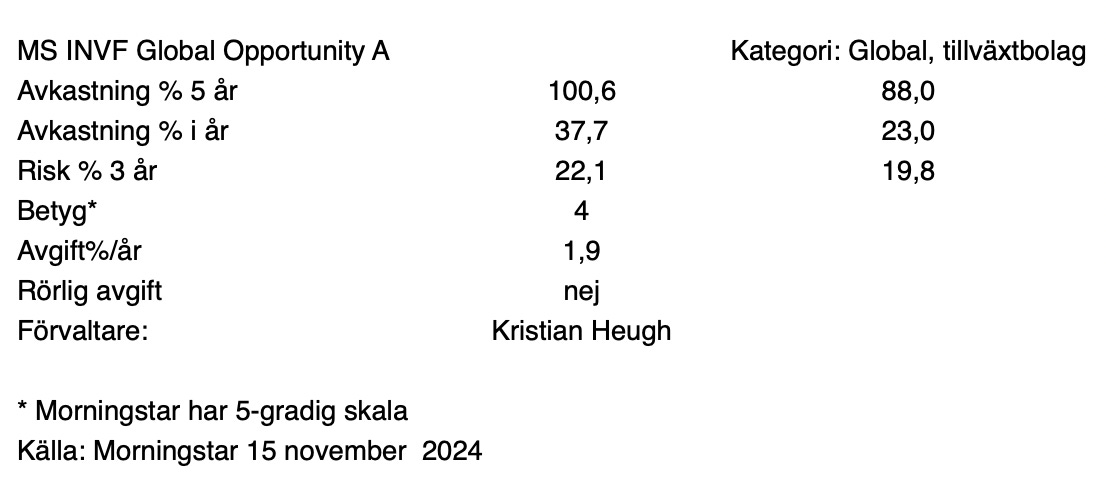 MS INVF Global Opportunity A är en globalfond med fokus på tillväxtbolag som förvaltas av Kristian Heugh sedan hösten 2010.