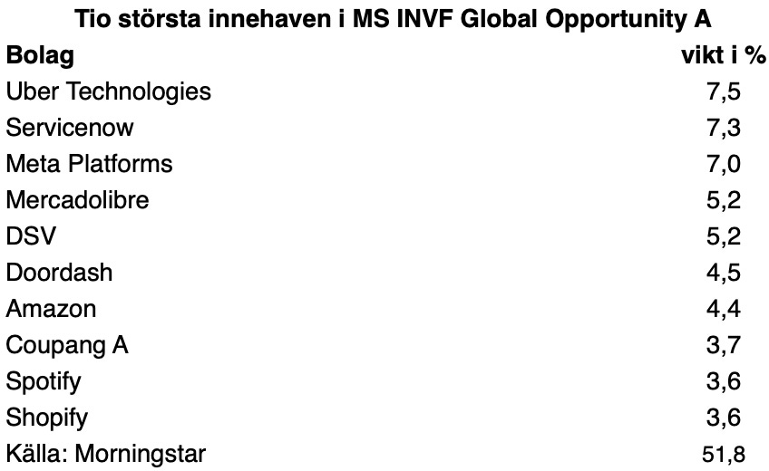 Värt att notera är att bland fondens tio största innehav, har Spotify-aktien uppvisat den högsta avkastningen med 164 procent det senaste året, näst efter kommer Doordash som avkastat 78 procent.