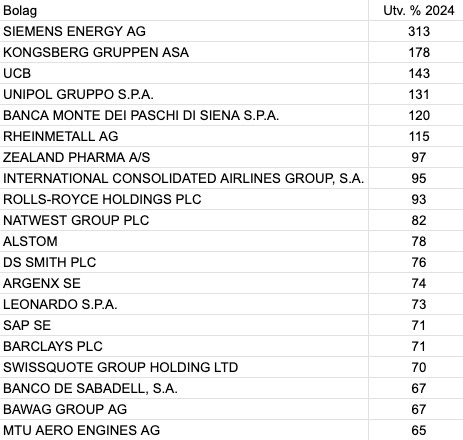 På plats nio och tio hamnar de två brittiska bolagen International Consolidated Airlines Group och Rolls-Royce Holdings. Bolagens aktier är upp 95 respektive 93 procent i år.
