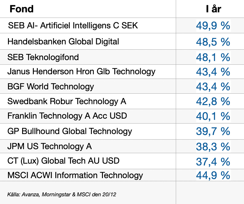 AI och halvledare dominerade 2024, men bara tre teknikfonder lyckades slå index. Vad kan vi lära oss av det? Vi dyker djupare in i de faktorer som drev sektorn och analyserar varför vissa fonder lyckades bättre än andra, trots en stark medvind.