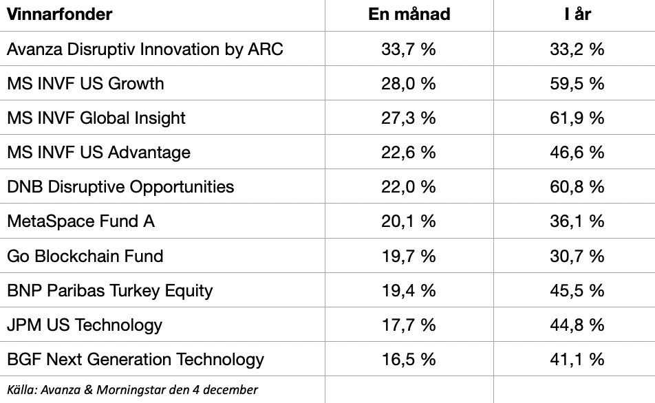 Även blockchain-orienterade fonder som Go Blockchain Fund har presterat starkt, med en avkastning på knappt 20 procent. Det är tack vare innehav i bolag som Coinbase och Microsrategy, vilka båda har en stor exponering mot bitcoins dramatiska uppgång. Microsrategy-aktien har stigit över 80 procent den senaste månaden.
