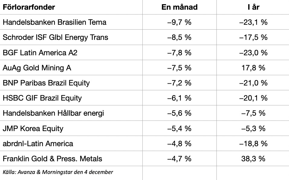 Överst bland förlorarfonderna finns Handelsbanken Brasilien Tema, som har tappat närmare 10 procent på en månad och 23 procent sedan årsskiftet. Fonden har tung exponering mot bolag som Petrobras och Vale, som har påverkats negativt av fallande råvarupriser, svag tillväxt och politisk osäkerhet i regionen.