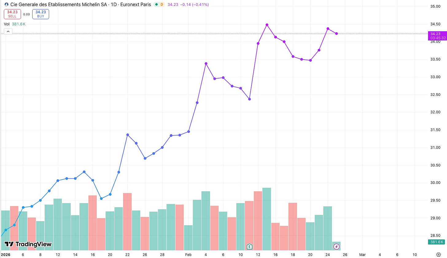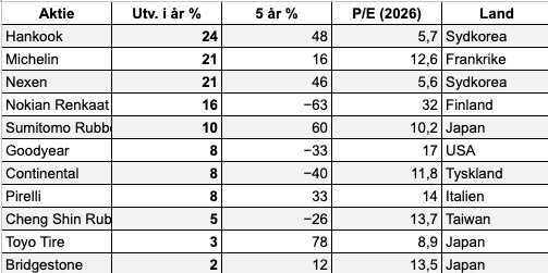 2026 har hittills varit gynnsamt för däcksektorn. Michelin är upp 21 procent, Hankook 24 procent och Nexen 21 procent. Även Nokian Renkaat har återhämtat sig med en uppgång på 16 procent, efter flera svaga år.