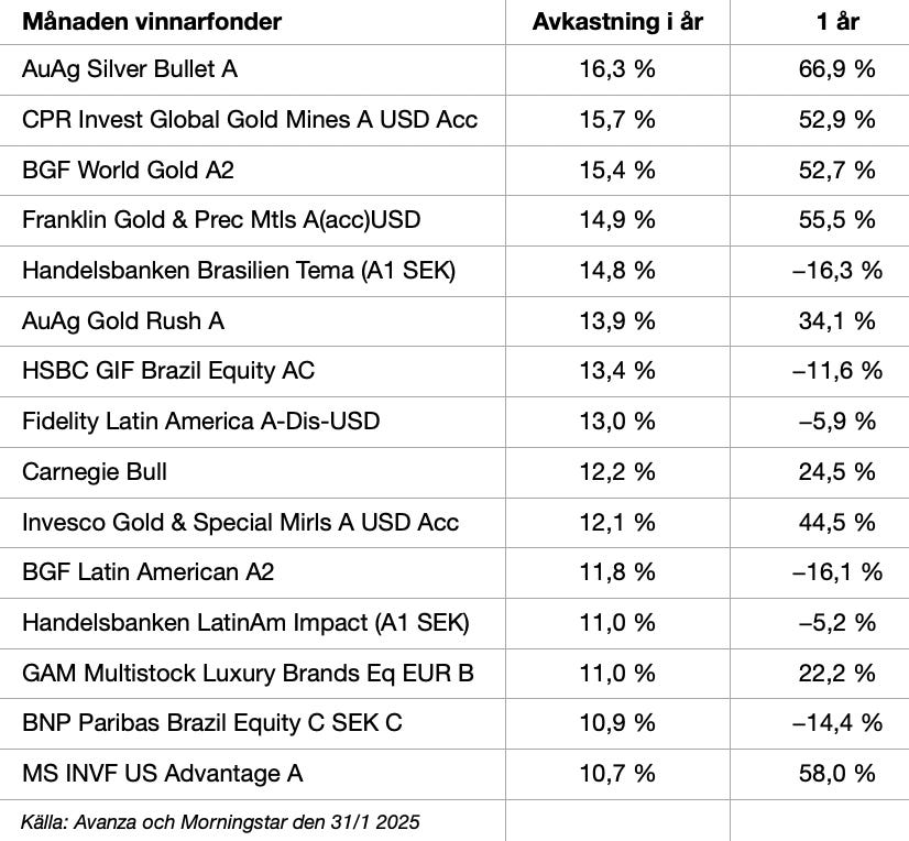 Januari bjöd på starka börser, men samtidigt präglades marknaden av geopolitisk oro och osäkerhet kring räntelandskapet. Råvarufonder och Brasilienfonder utvecklades bäst under månaden, med stöd av stigande råvarupriser och starka valutor.