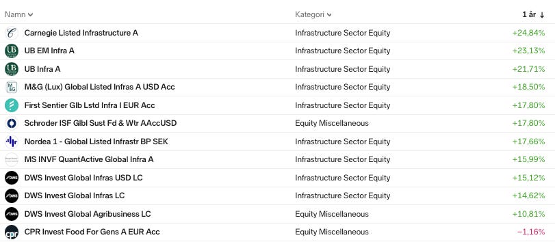 Totalt finns ett tiotal ETFer respektive fonder på Nordnets investeringsplattform med tydligt fokus på infrastrukturinvesteringar, vilket gör det möjligt att bygga exponering mot olika delar av området.