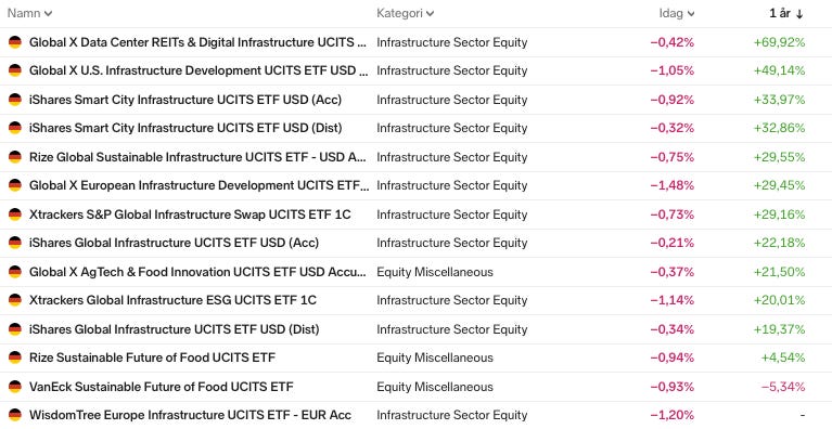 För investerare finns flera vägar in i temat. Breda ETFer som iShares Global Infrastructure UCITS ETF och SPDR Morningstar Multi Asset Global Infrastructure UCITS ETF ger en diversifierad exponering mot klassisk infrastruktur som energi, transport och nät, och fungerar ofta som en stabil bas i portföljen.