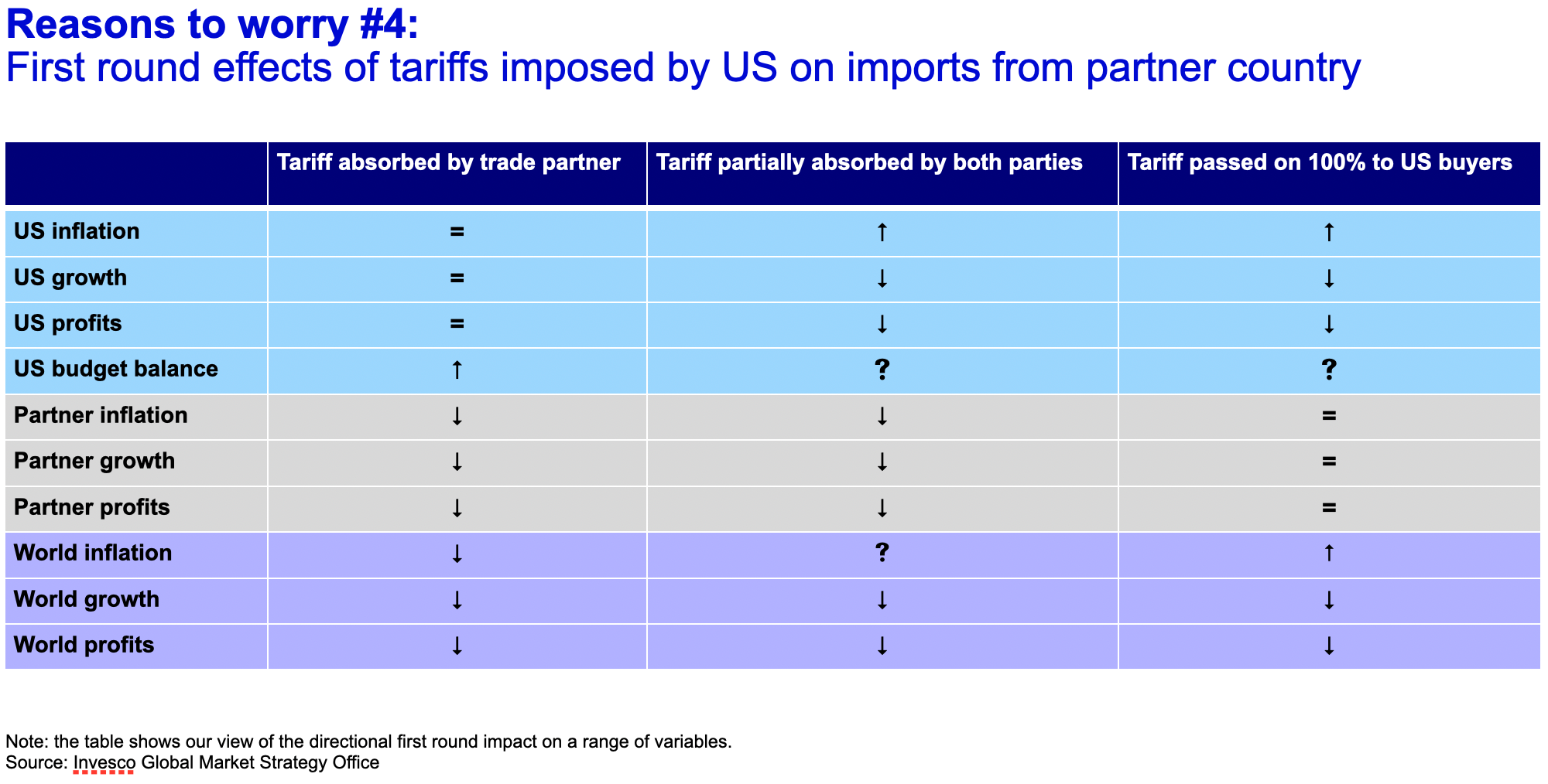 Han betonar att effekterna på inflation och företagsmarginaler beror på hur dessa tullar absorberas. Om exportländerna tvingas stå för kostnaden kan deras ekonomier försvagas, medan en fullständig överföring av kostnaden till amerikanska konsumenter skulle driva upp inflationen och pressa köpkraften. Ett delat ansvar mellan parterna skulle kunna mildra effekterna, men ändå skapa tryck på både marginaler och prisnivåer.