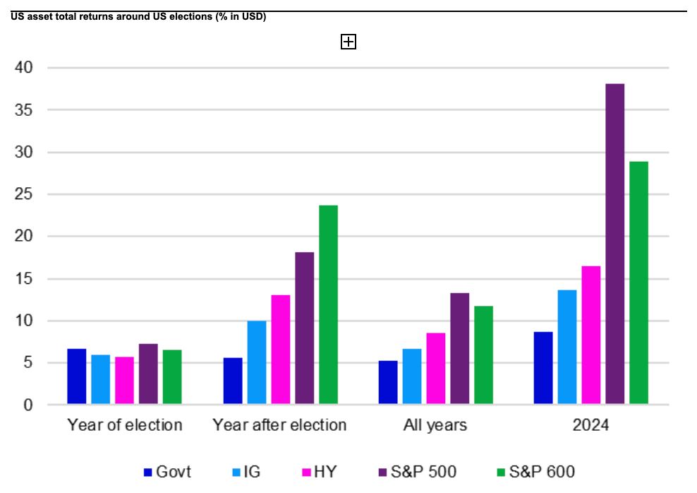 ”Historiskt sett har finansmarknaderna presterat väl under det första året efter ett amerikanskt presidentval, särskilt när den amerikanska centralbanken FED inleder en period av räntesänkningar. Så länge en recession kan undvikas skapar detta en stark grund för positiv marknadsutveckling.”