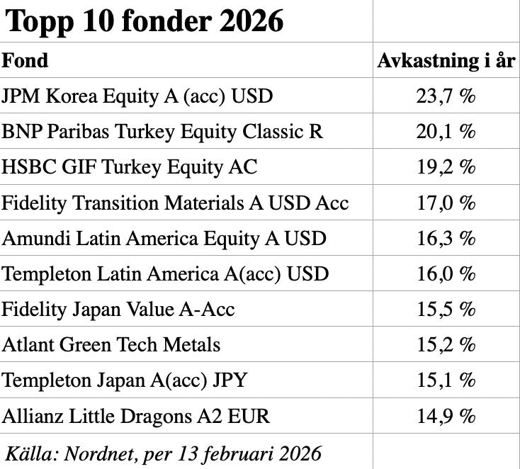 Genomgången, baserad på aktiefonder tillgängliga via Nordnets fondplattform, visar hur kapital i ökande grad söker sig till marknader med lägre värderingar, starkare kassaflöden och större relativ attraktivitet.