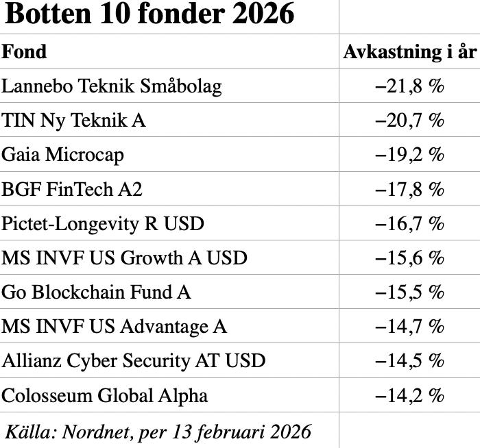 Den svagaste utvecklingen återfinns i teknikfonder, särskilt de med fokus på mindre bolag. Lannebo Teknik Småbolag har fallit 21,8 procent sedan årsskiftet, följt av TIN Ny Teknik med en nedgång på drygt 20 procent. Även andra teknikfonder med exponering mot mindre tillväxtbolag har haft en svag utveckling.