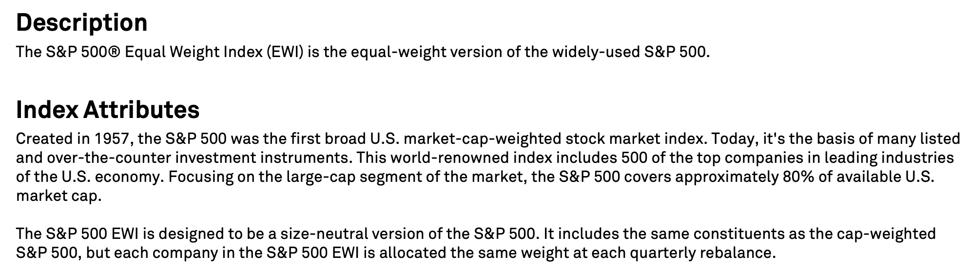 Ett likaviktat index erbjuder en mer balanserad exponering genom att ge varje bolag samma vikt, oavsett dess börsvärde. I S&P 500 Equal Weight Index får varje bolag en vikt på 0,2 procent vid varje kvartalsbalansering, vilket ger en mer rättvis bild av marknadens faktiska bredd och dynamik.
