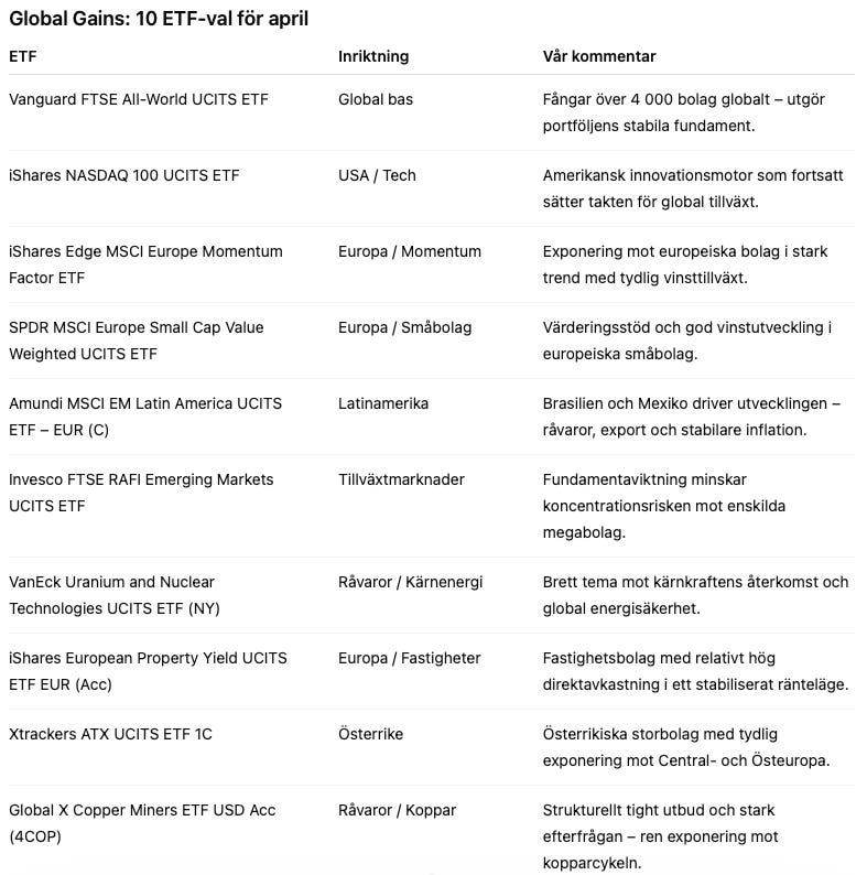 Mot denna bakgrund genomför vi en förändring i ETF-portföljen inför april månad. Vi väljer att avyttra hela innehavet i iShares STOXX Europe 600 Retail UCITS ETF och adderar i stället VanEck Uranium and Nuclear Technologies UCITS ETF.