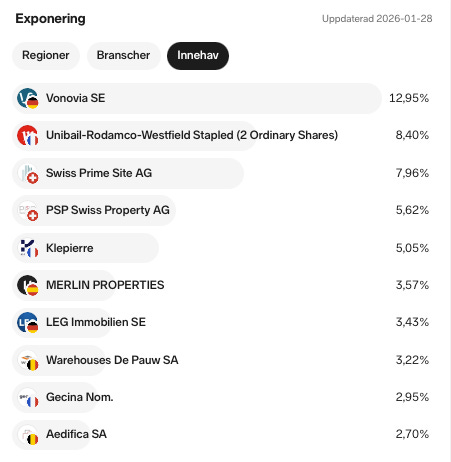 Bland fondens största innehav finns Vonovia, Unibail Rodamco Westfield, Swiss Prime Site, PSP Swiss Property och Klepierre. Även LEG Immobilien, Warehouses De Pauw, Gecina, Castellum och Cofinimmo ingår. Exponeringen är koncentrerad till Tyskland, Frankrike, Schweiz, Belgien och Norden.