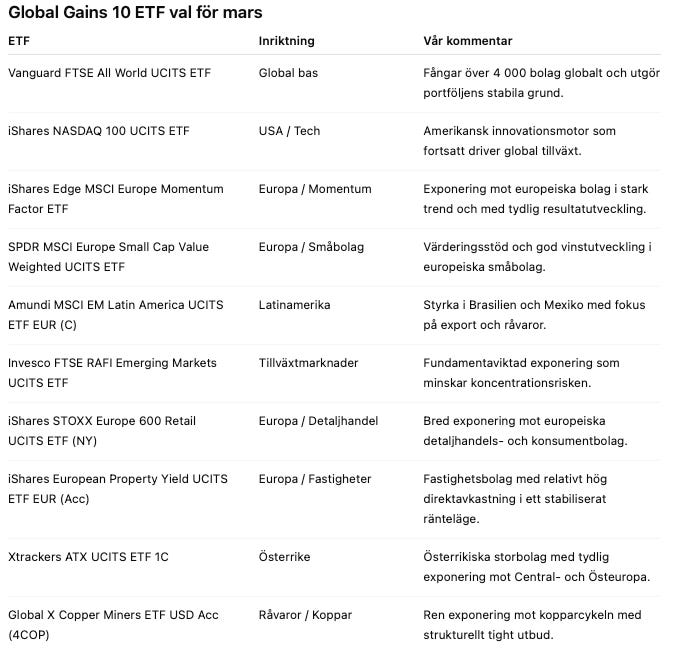 Mars innebär därmed att vi roterar från global hälsovård till europeisk fastighet, samtidigt som vi behåller exponeringen mot Centraleuropa via ATX. Portföljen får därmed en tydligare europeisk inriktning och större inslag av löpande kassaflöden.