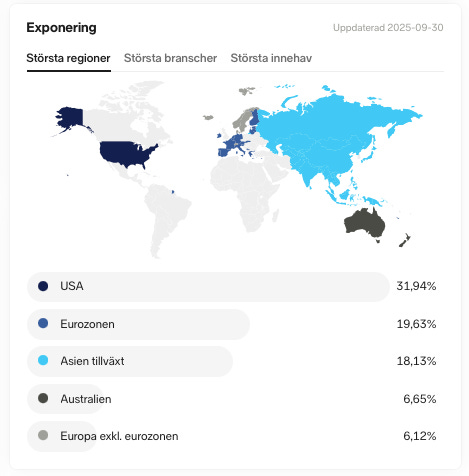 Sektormässigt dominerar finans 34 procent och råvaror 18 procent, medan konsumtion och industri ger ytterligare bredd. Avgiften är låga 0,20 procent, och tillsammans med vår Asienexponering skapar fonden en mer komplett global portfölj.