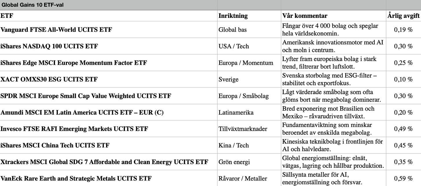 Samtidigt finns mycket som talar för fortsatt styrka. Kombinationen av globala index, europeiska värde- och småbolagsfonder, amerikansk innovation och asiatisk AI-exponering skapar en robust exponering. Med den nya energifonden och Latinamerika som tillväxtmotorer står ETF-listan väl rustad för volatilitet – och positionerad för långsiktig avkastning.