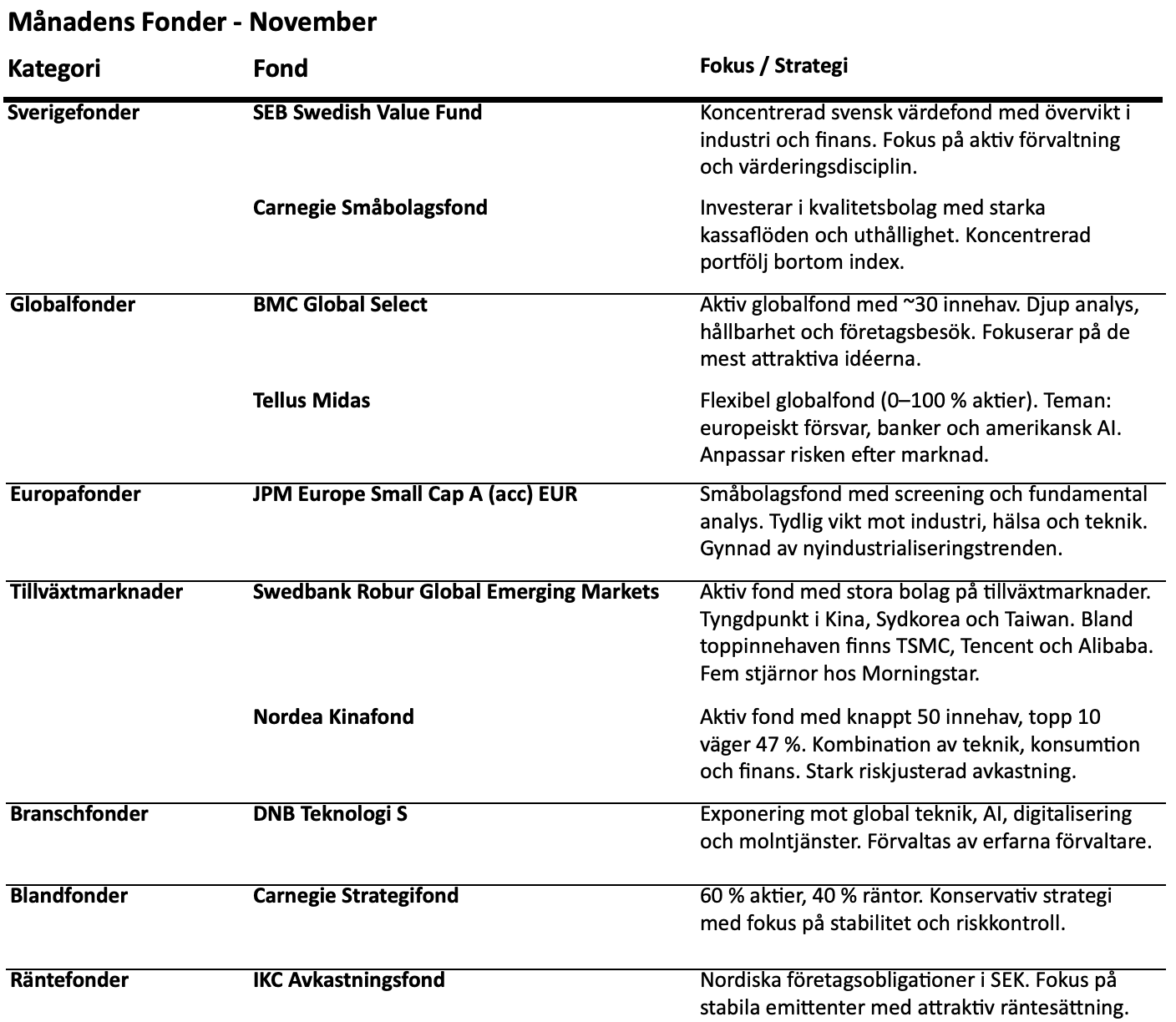 Välkommen till novemberutgåvan av Månadens Fonder – vår månatliga genomgång av fonder som kan bidra till en balanserad och långsiktig portfölj.
