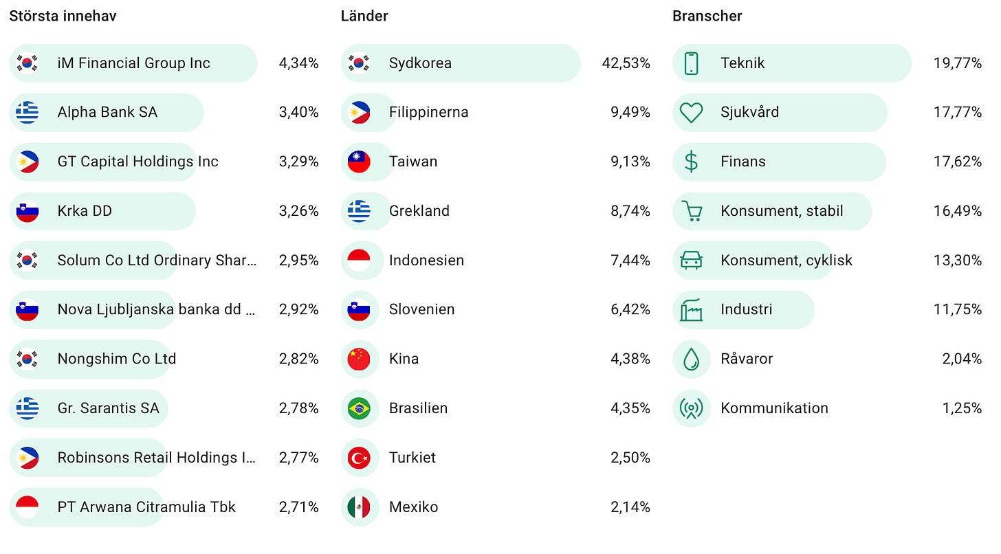 Swedbank Robur Small Cap Emerging Markets Fonden särskiljer sig genom sin höga exponering mot sydkoreanska småbolag och en väl avvägd portfölj med drygt 50 innehav där inget enskilt dominerar. Kombinationen av asiatiska teknik- och industribolag samt grekiska finansaktier har gjort fonden till en av de starkaste i sin kategori under året.