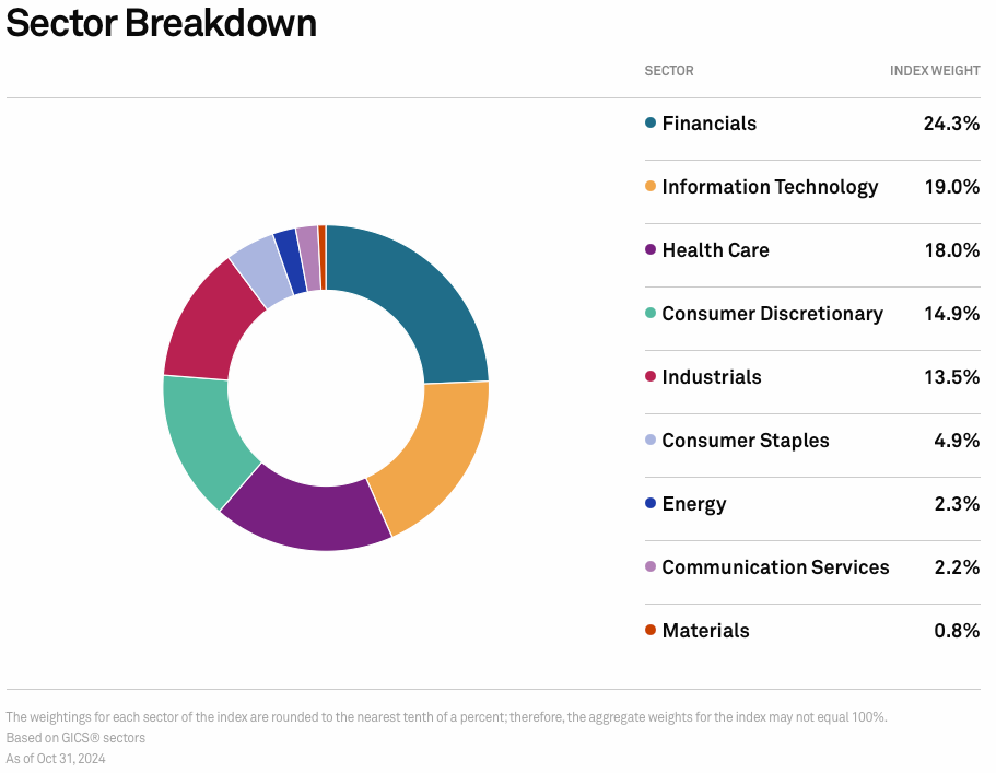 Indexet innehåller 30 av de mest inflytelserika företagen i USA och är konstruerat för att representera landets industriella och kommersiella landskap. Det är S&P Dow Jones-kommittén som enväldigt beslutar om sammansättningen av bolag och sektorer.