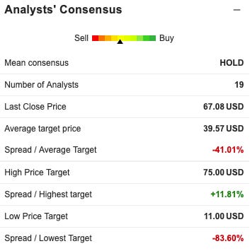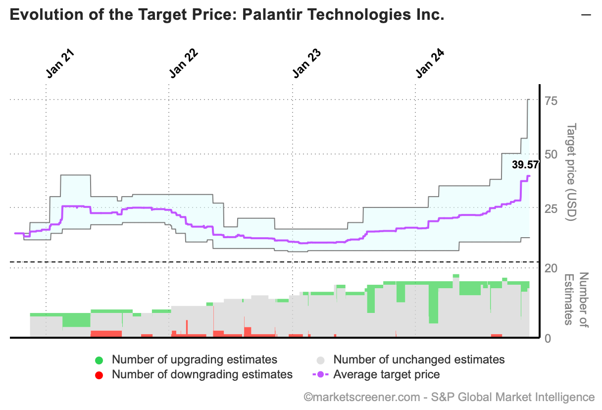 Den senaste tiden har allt flera analytiker sänkt sin rekommendation för Palantir. Av de 19 analytiker som följer bolaget har fyra en köprekommendation, åtta är neutrala och sju rekommenderar sälj.