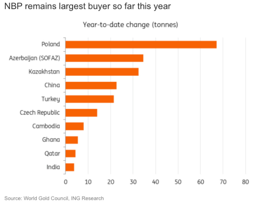 Sedan 2022 har de köpt över 1 000 ton guld per år – den starkaste köptakten sedan 1970-talet. Kina har nu elva månader i rad ökat sina reserver. Polen vill höja guldandelen i sina valutareserver till 30 procent. Turkiet fortsätter diversifiera bort från dollarn.