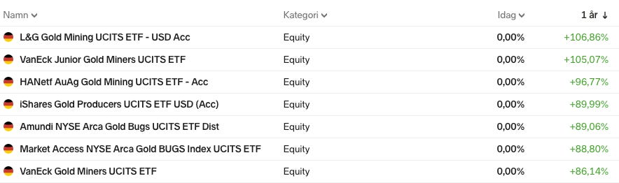 Även bredare alternativ som iShares Gold Producers UCITS ETF ligger nära 90 procent upp. Under samma period har själva guldpriset ökat cirka 50 procent.