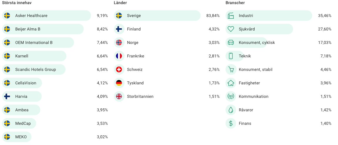 Fondens profil är tydligt nordisk, med hela 84 procent av kapitalet investerat i svenska bolag. Bland de största innehaven återfinns Asker Healthcare, Beijer Alma, OEM International, Karnell och Scandic Hotels – bolag med stabila kassaflöden och tydlig affärsmodell.