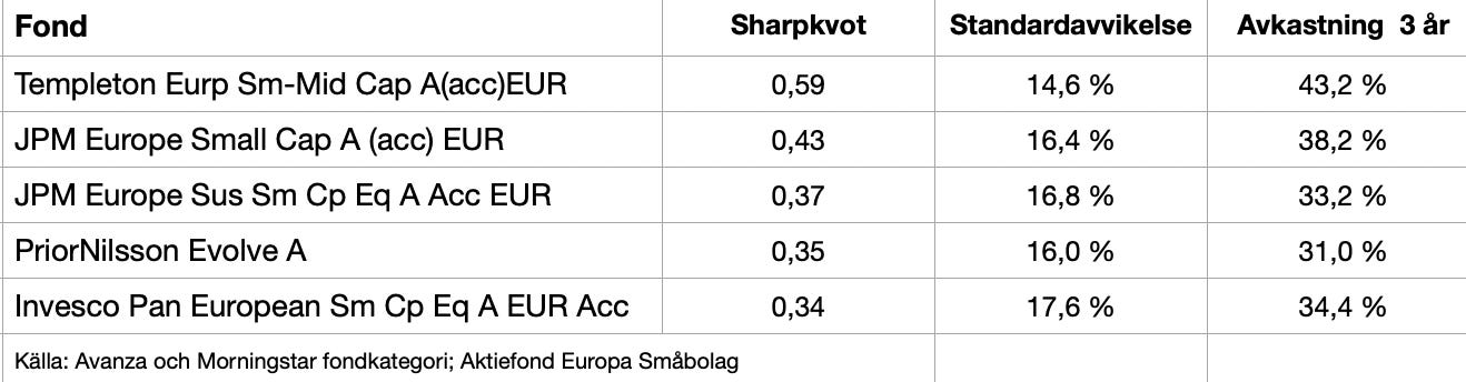 För att belysa vilka fonder som lyckats bäst i denna miljö har vi valt ut fem småbolagsfonder med högst Sharpekvot i kategorin "Aktiefond Europa Småbolag" på Avanzas fondplattform.