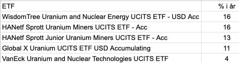 Bäst i år har det gått för WisdomTree Uranium and Nuclear Energy och HANetf Sprott Uranium Miners som vardera är upp 16 under 2026. Svagast har det gått för VanEck Uranium and Nuclear Technologies.