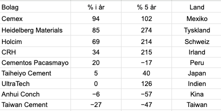 För cementbolagen i Asien har läget varit tuffare. Indiska cementjätten UltraTech är oförändrad i år, trots att Indien sett till volym är världens snabbast växande cementmarknad. Orsaken är främst hög värdering i kombination med stigande energi- och transportkostnader samt ökad konkurrens. Bolaget är fortsatt dyrt, med ett framåtblickande P/E-tal på omkring 36, även om vinsten per aktie väntas stiga med nära 50 procent nästa år.
