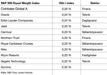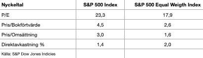 Det pekar på att investerare i Equal Weight-indexet i dagsläget betalar mindre för varje vinstkrona. Även direktavkastningen är något högre, eftersom utdelningar från mindre bolag väger tyngre än i det traditionella indexet där utdelningarna ofta späds ut av stora teknikbolag med låg utdelningsandel.