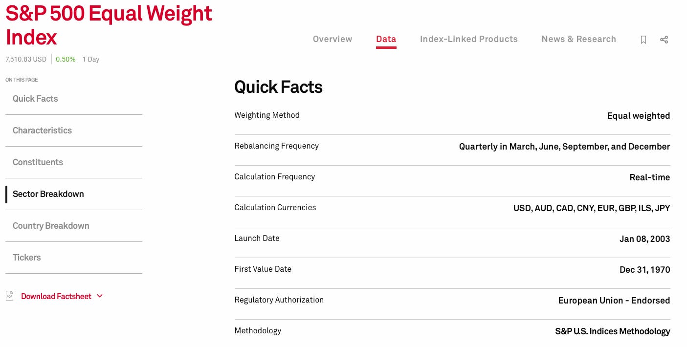 Ett likaviktat index fördelar vikten lika mellan samtliga bolag. I fallet med S&P 500 Equal Weight Index innebär det att varje bolag väger 0,2 procent vid ombalansering, oavsett börsvärde. Detta skapar en mer balanserad avkastningsprofil där inget enskilt bolag dominerar.