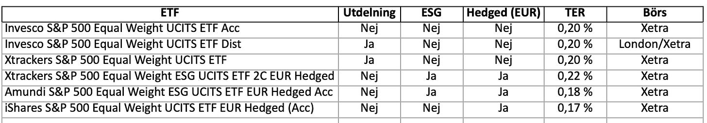 Det finns alltså flera sätt att implementera en likaviktad strategi, beroende på om man föredrar ESG-filter, utdelningar, valutahedging eller låg avgift. Tabellen nedan sammanfattar egenskaperna hos de mest relevanta fonderna.