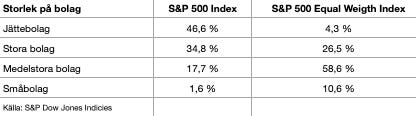 I ett börsvärdeviktat index får jättebolag som Apple, Microsoft och Nvidia ett oproportionerligt stort genomslag, medan små och medelstora bolag knappt märks i helheten.