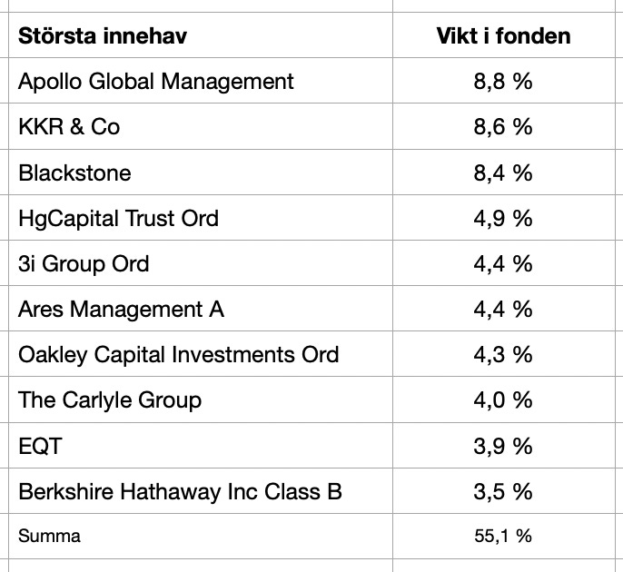 De tio största innehaven utgör 55 procent av fondens värde och innehåller framstående namn som Apollo Global Management med en vikt på 9 procent och KKR på 8,6 procent.