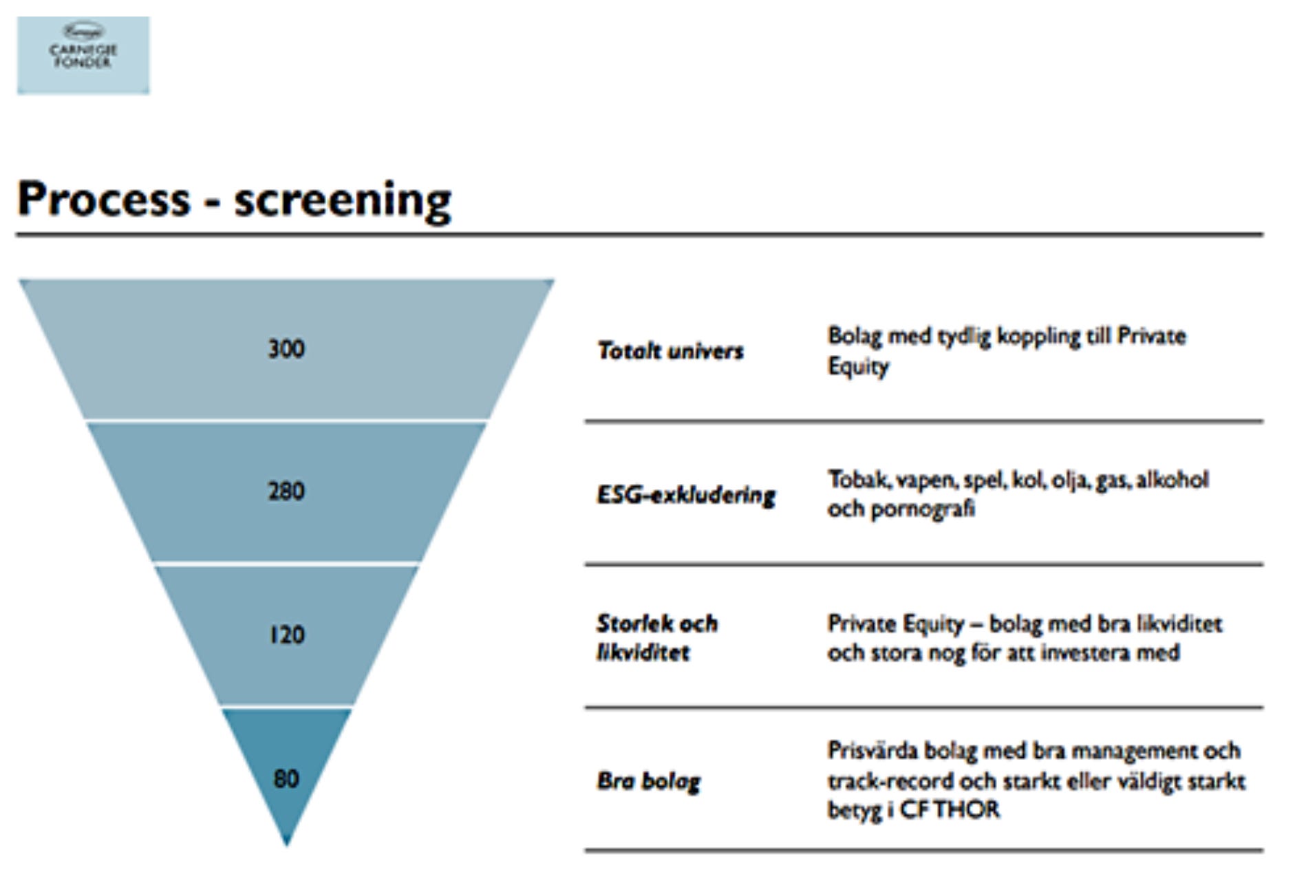 Carnegie Listed Private Equity består för närvarande av 37 innehav. Trots portföljens koncentration ger den en imponerande riskspridning eftersom varje riskkapitalbolag i fonden i sin tur investerar i ett stort antal onoterade företag. Det innebär att investerare indirekt får exponering mot hundratals bolag över hela världen.