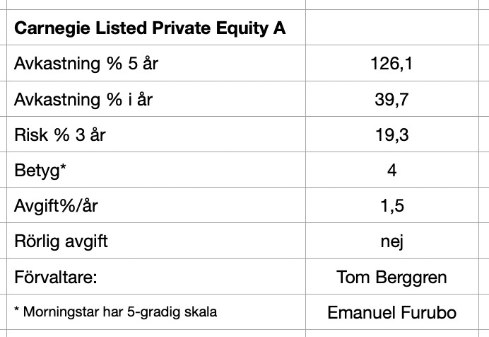 Carnegie Listed Private Equity har förvaltats av Tom Berggren sedan 2009 och har numera Emanuel Furubo som medförvaltare.