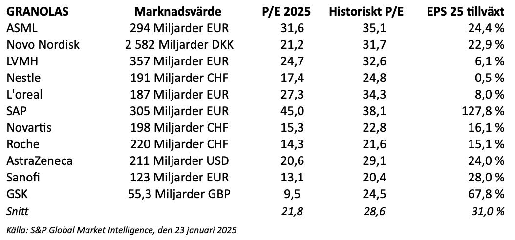 Jämfört med amerikanska aktier erbjuder europeiska bolag – särskilt Granolas – en mer balanserad risk- och avkastningsprofil, tack vare deras stabila vinsttillväxt och breda globala exponering. Granolas värderas något högre än det bredare Stoxx 600, vilket speglar deras starkare tillväxt och lönsamhet. Trots detta är de fortfarande betydligt billigare än Magnificent Seven och Nasdaq 100, vilket gör dem till ett attraktivt val för investerare som söker långsiktig stabilitet utan att betala en premie som för amerikanska teknikbolag.