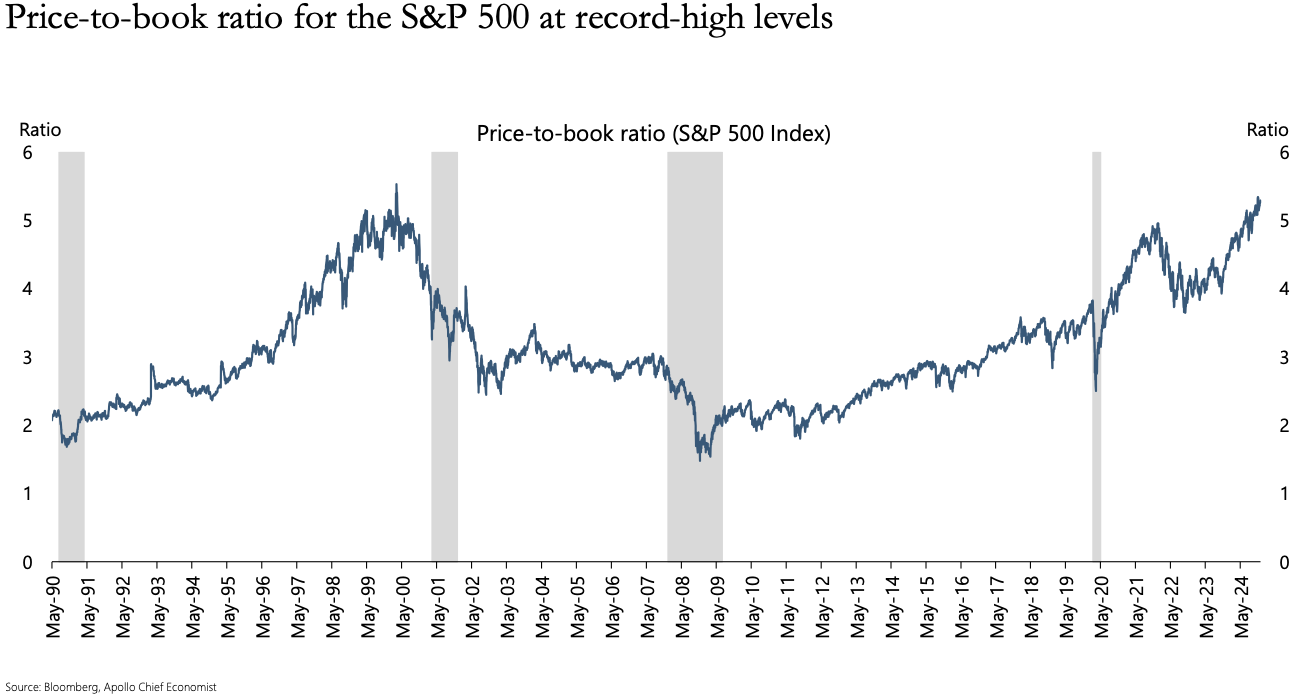 De amerikanska börsernas värderingar är på historiskt höga nivåer, med S&P 500 indexets price-to-book på rekordnivåer. Det speglar marknadens optimism men innebär också en ökad risk för framtida nedgångar, särskilt om vinsttillväxten inte når förväntningarna.
