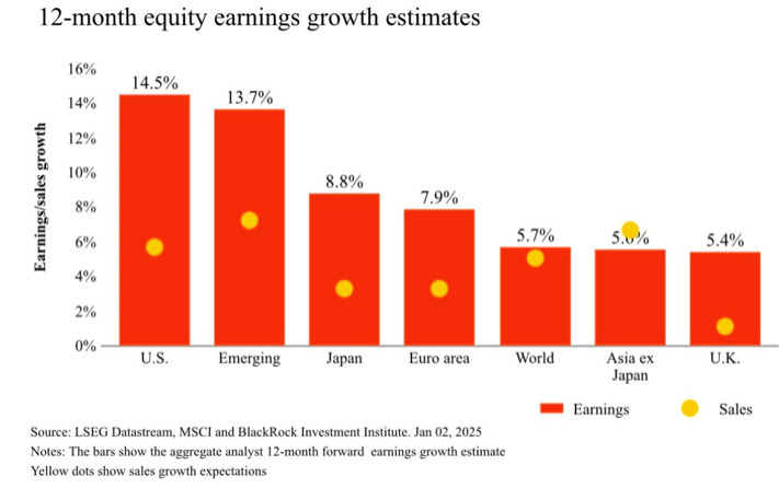 USA-börserna förväntas leverera en stark vinsttillväxt på 14,5 procent under de kommande 12 månaderna. Detta står i skarp kontrast till euroområdets 7,9 procent och Japans 8,8 procent.