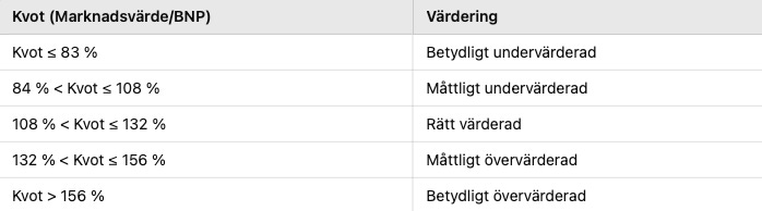 Historiskt har Buffett beskrivit denna indikator som "det bästa måttet på var värderingarna befinner sig vid en given tidpunkt." En kvot runt 100 procent anses indikera en rätt värderad marknad, medan nivåer under 100 procent kan peka på köplägen. När kvoten överstiger 100 procent, och särskilt vid extrema nivåer, kan det signalera en överhettad marknad med ökad risk för en korrigering.